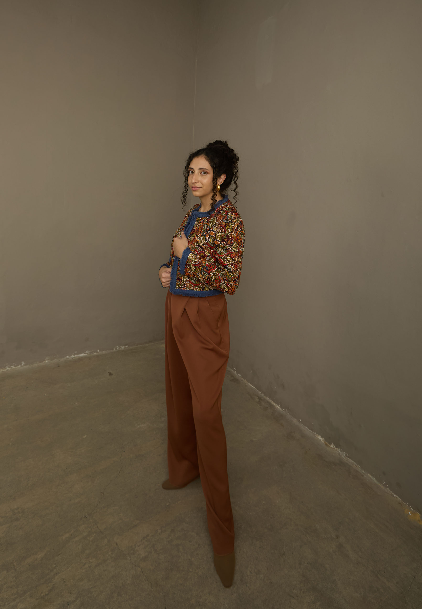 La Chaqueta Johanna está inspirada en una diseñadora que sabe tomar riesgos que funcionan en la moda, una mujer que no le tiene miedo a los patrones inusuales o a los colores vibrantes. Es para una mujer que no teme sobresalir y que disfruta saber que lo puede llevar con confianza . Esta chaqueta con un patrón enigmático y flequillos azules será la prenda perfecta para tu armario.