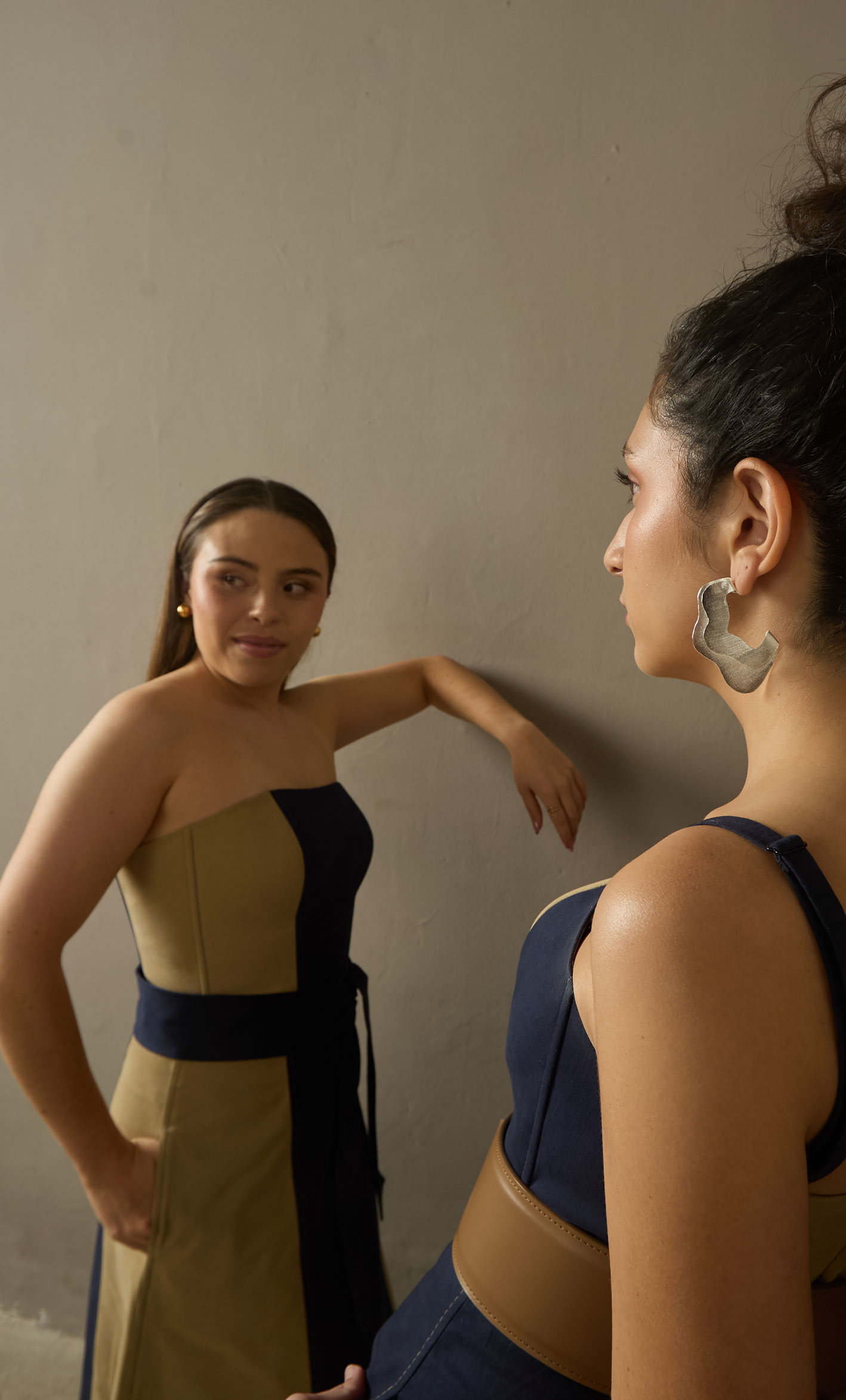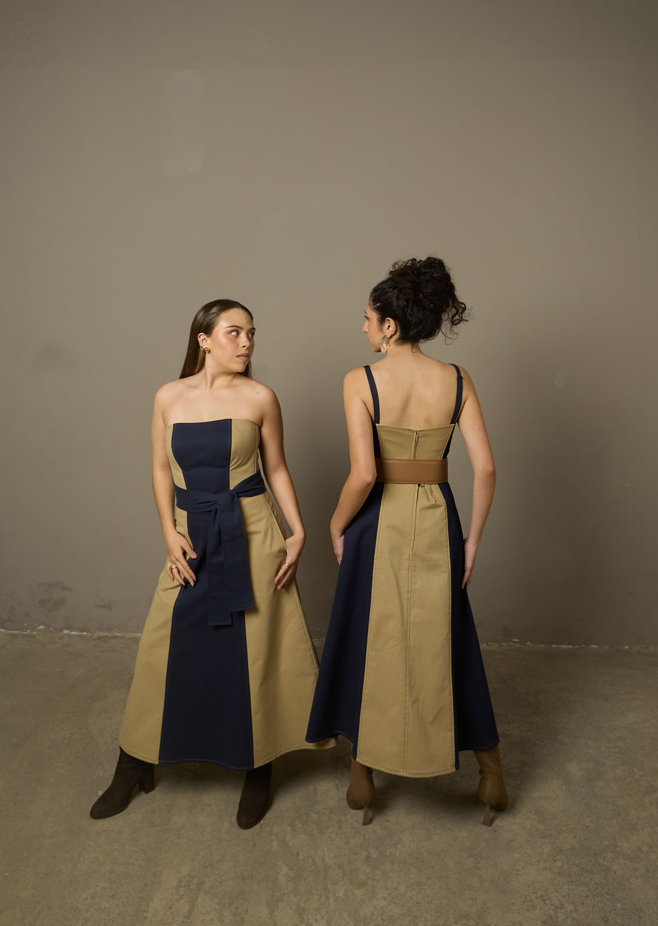 Talla modelo (*Azul con Beige): Isabela mide 162 cm  y está usando la talla 36